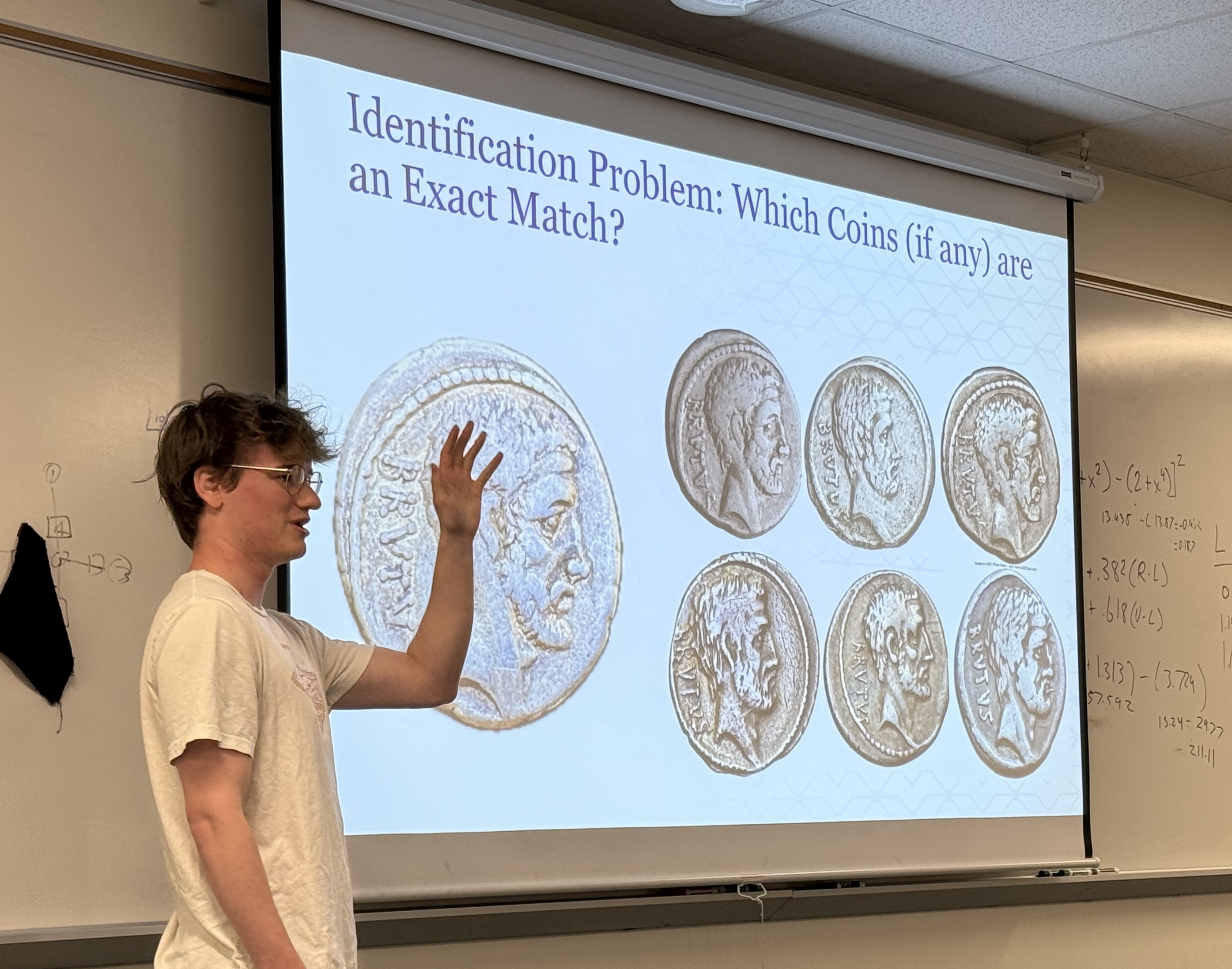 Jackson Greer (CS '25) presented his research on deep learning methods for ancient coin identification and historical provenance recovery. His work will assist the Madison Art Collection in recovering lost ownership information from the Sawhill Ancient Coin Collection. He applied various deep metric learning methods to existing datasets of Roman Republican coins and validated his approach from sample images from the Sawhill collection. His presentation is available online (PDF).